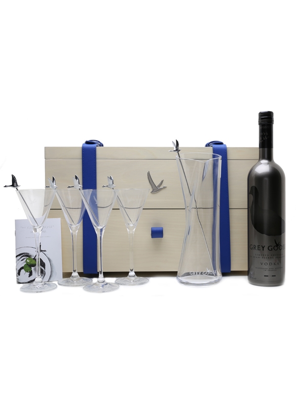 The Grey Goose Martini Gift Set contains a bottle of Grey Goose vodka, a large branded mixing glass, four martini glasses with olive picks, and a branded stirrer. This limited edition set was designed by Jean-Pierre Braganza and is presented in a fitted wooden case.