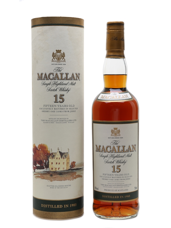 A bottle of The Macallan 15 Year Old Single Highland Malt Scotch Whisky. This was distilled in 1985, exclusively matured in selected sherry oak casks from Jerez, Spain.