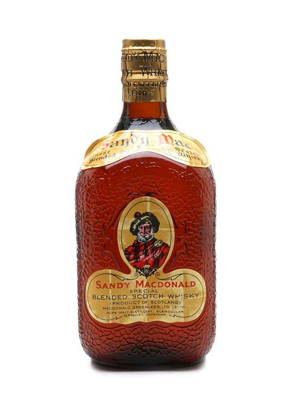 A bottle of Sandy MacDonald Special blended Scotch whisky, produced and bottled with a spring cap closure by MacDonald Greenlees Ltd., we estimate in the 1950s.