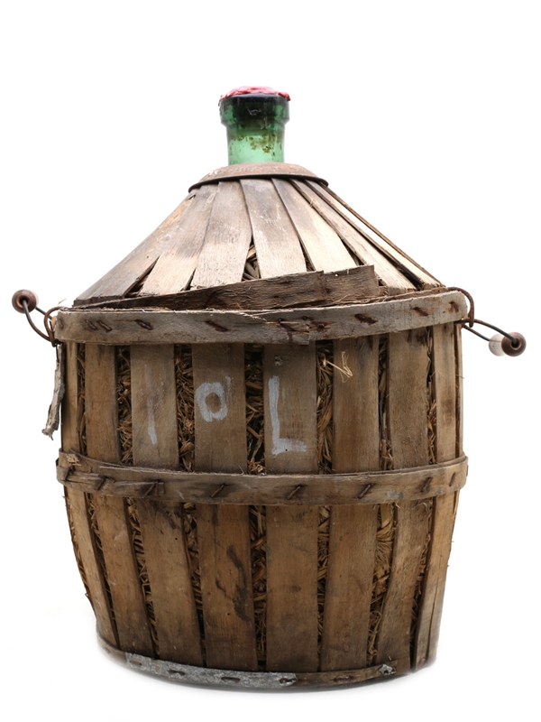 A large bottle of French rhum, presented in a glass bottle with a wicker casing.