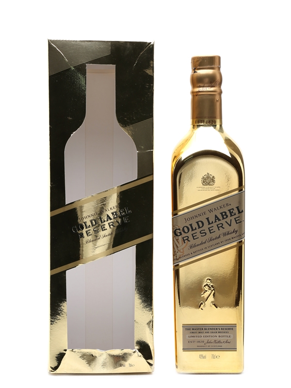 A bottle of Johnnie Walker Gold Label Reserve Limited Edition Bottle covered in gold lacquer to create a gold bullion effect. This was released following the Gold Label Reserve relaunch in 2012. Single Malt whisky from Clynelish distillery is included in the blend.