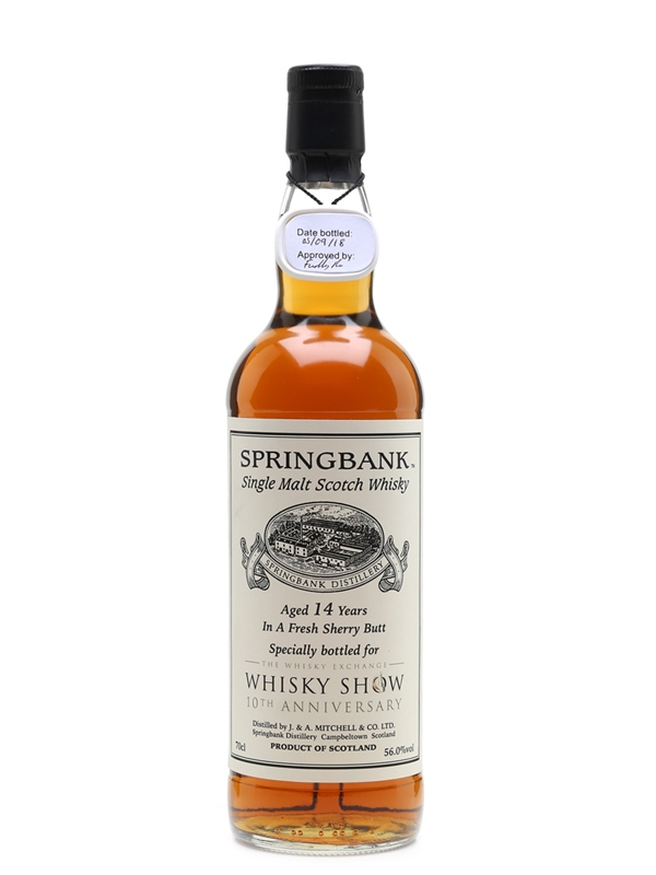 A bottle of Springbank 14 Year Old, bottled at cask strength for the 10th anniversary of The Whisky Exchange Whisky Show. This single bottle was specially selected by the Springbank team from one of their favourite casks, a fresh sherry butt. This single bottled was removed on 5 September 2018, aged 14 years.