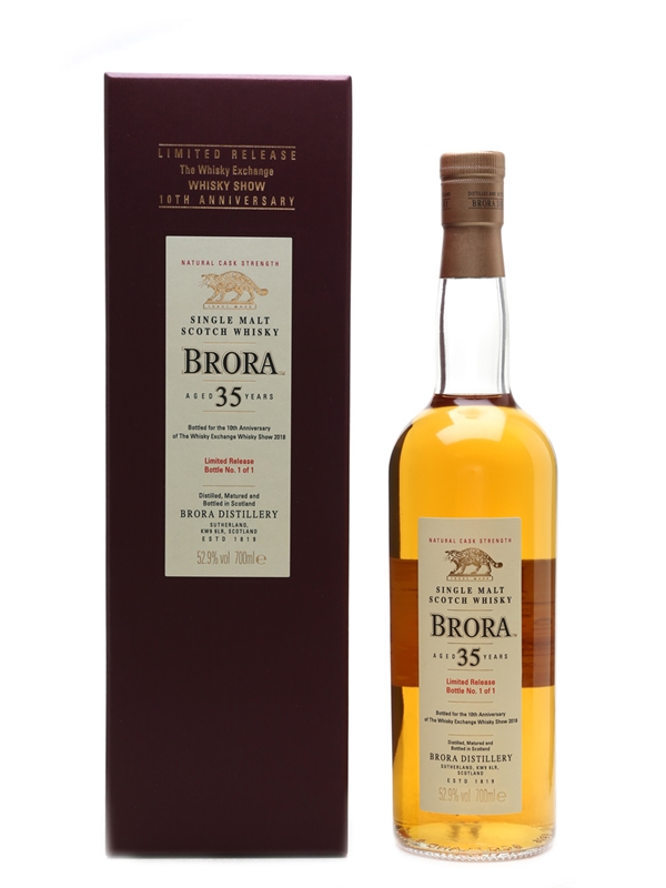 A one-off bottle of Brora 35 Year Old, specially presented to be auctioned for charity for the 10th anniversary of The Whisky Exchange Whisky Show in 2018.