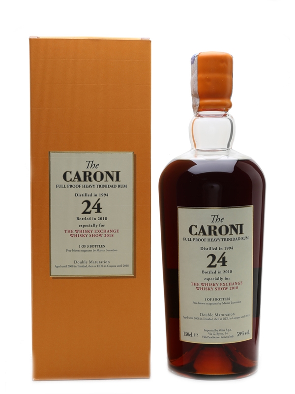 A 150cl magnum bottle of Caroni 24 Year Old Full Proof Heavy Trinidad rum. This was distilled in 1994, matured in Trinidad until 2008, and at DDL in Guyana until 2018. It was bottled specially for the 10th anniversary of The Whisky Exchange Whisky Show in 2018, and is presented in a free-blown magnum by Master Lunardon.