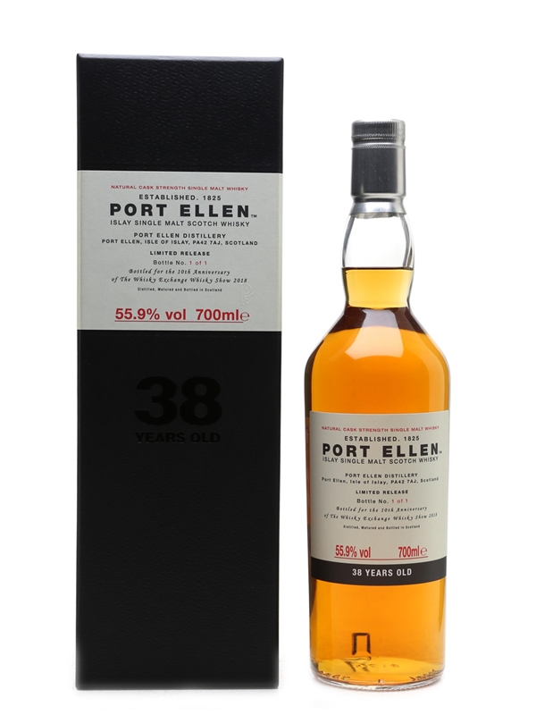 A unique bottle of Port Ellen 38 Year Old, specially presented to be auctioned for charity for the 10th anniversary of The Whisky Exchange Whisky Show in 2018.