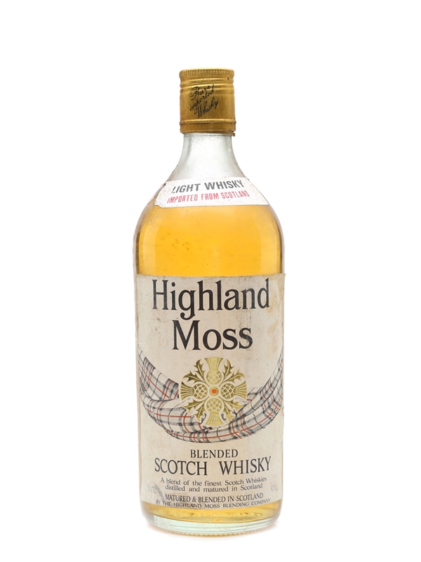 A bottle of Highland Moss Light Whisky, bottled in Scotland for export. We estimate this was bottled in the 1970s.