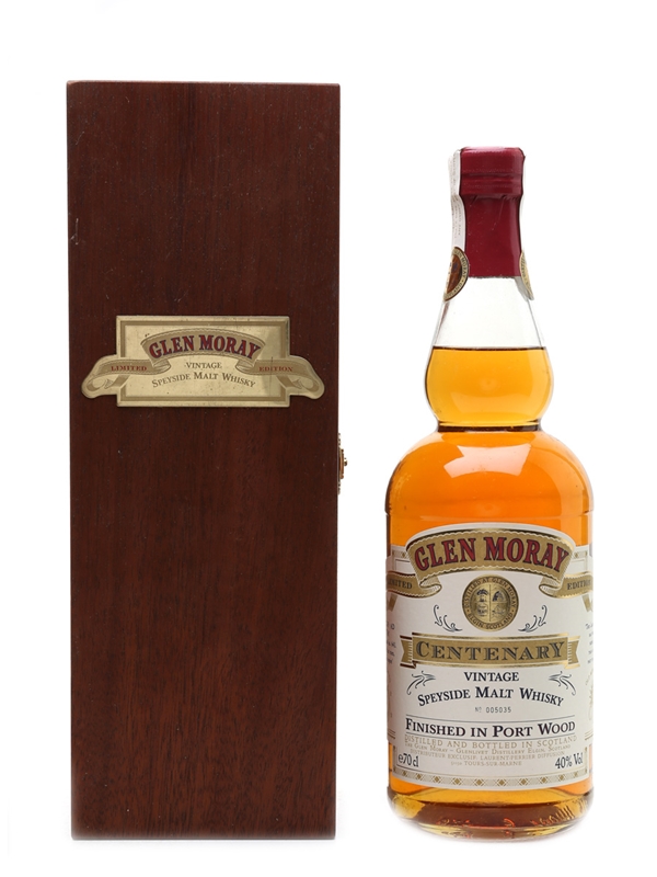 A bottle of Glen Moray released for the distillery's Centenary, and presented in a wooden box. Four casks were selected from the 1976, 1977, 1978, and 1979 vintages. The ex-bourbon casks were left to mature until 1987 when the whisky was transferred to port casks from the Douro valley.
