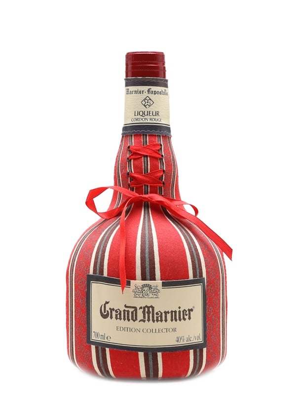A limited edition bottle of Grand Marnier Cordon Rouge Edition Collector, wearing a stripy corset. This liqueur is made with Cognac and wild tropical oranges.