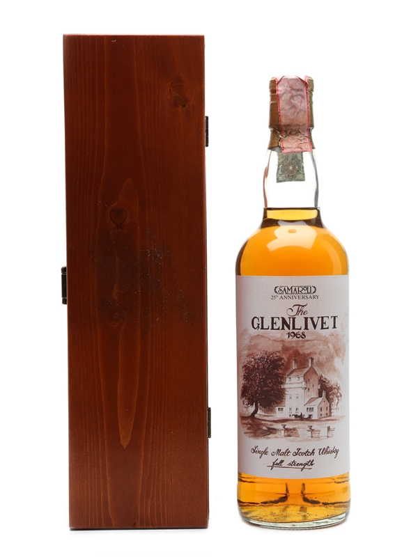 A bottle of The Glenlivet single malt Scotch whisky. This was distilled in 1968 and bottled in 1993 to commemorate the 25th anniversary of Italian importer Samaroli.