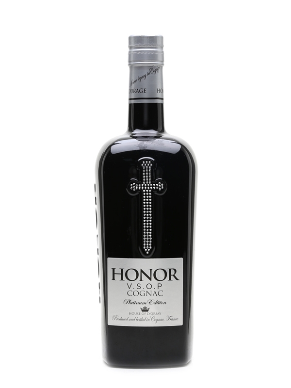 A bottle of Honor VSOP Platinum Edition Cognac, made from eaux-de-vie from the Grand Champagne, Petite Champagne, Fins Bois and Bon Bois regions, matured in Limousin oak casks. This was produced and bottled by Birkedal Hartmann.