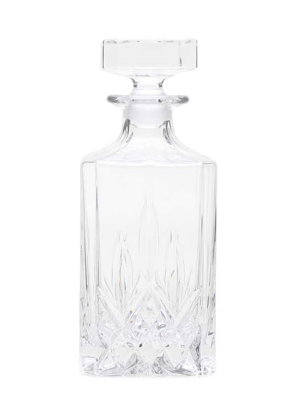 A crystal decanter with a stopper. This is approximately 22 centimetres tall including the stopper, and 9 centimetres wide.