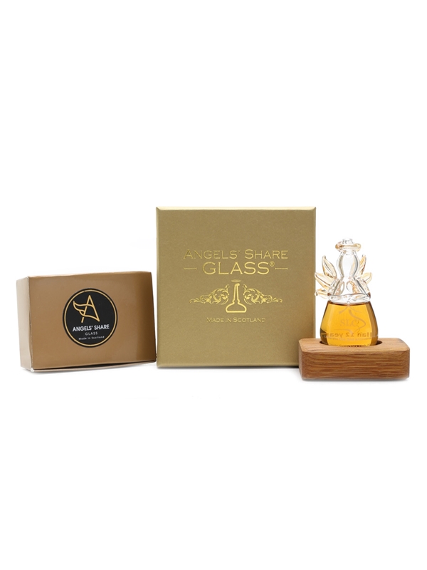 A 2.5cl bottle of The Macallan 12 Year Old, The Angels' Share, presented in a hand-blown angel-shaped bottle with a small wooden stand. This was produced to celebrate the 2nd anniversary of Saigon Liquor Collectors Club in 2017.