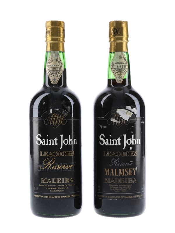 This lot contains two bottles of Saint John Reserve Malmsey Madeira, bottled and shipped for Leacock & Co. Lda., by the Madeira Wine Co. Lda.