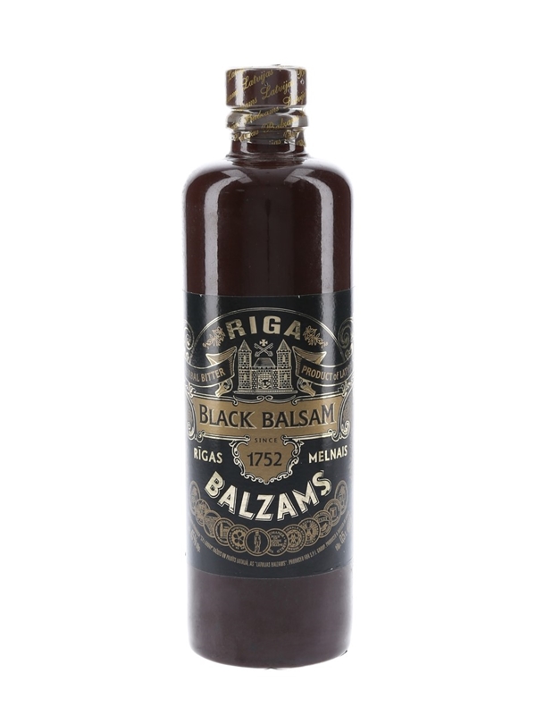 A bottle of Riga Black Balsam Herbal Bitter, a Latvian liqueur created from an infusion of botanicals and herbs.The recipe can be traced back to 1752 and is a blend of 24 ingredients including roots, berries, grasses and buds.