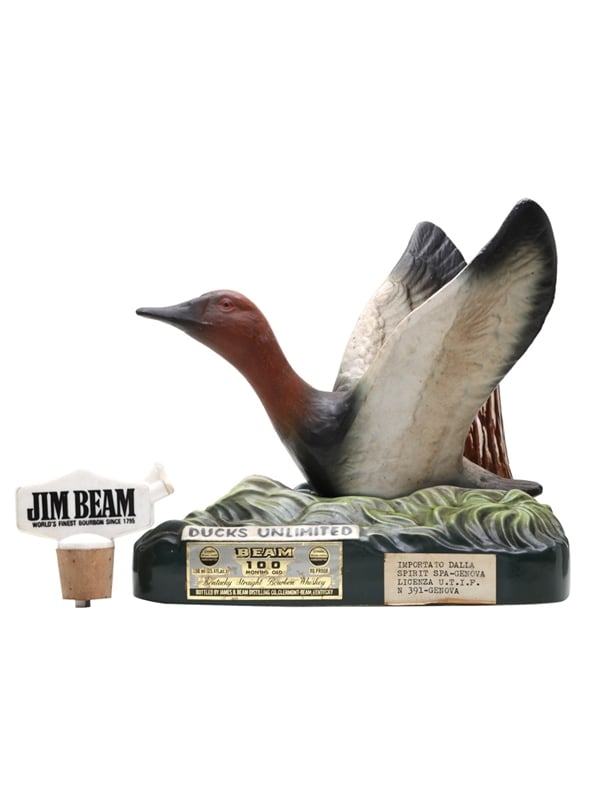 A bottle of Beam 100 Months Old Kentucky straight bourbon whiskey, presented in a ceramic Canvasback Drake decanter with a branded pourer. This was created to support the work of the North American waterfowl conservation organization Ducks Unlimited. The bottom of the decanter is embossed: Genuine Regal China 1979. This was imported to Italy by Spirit.