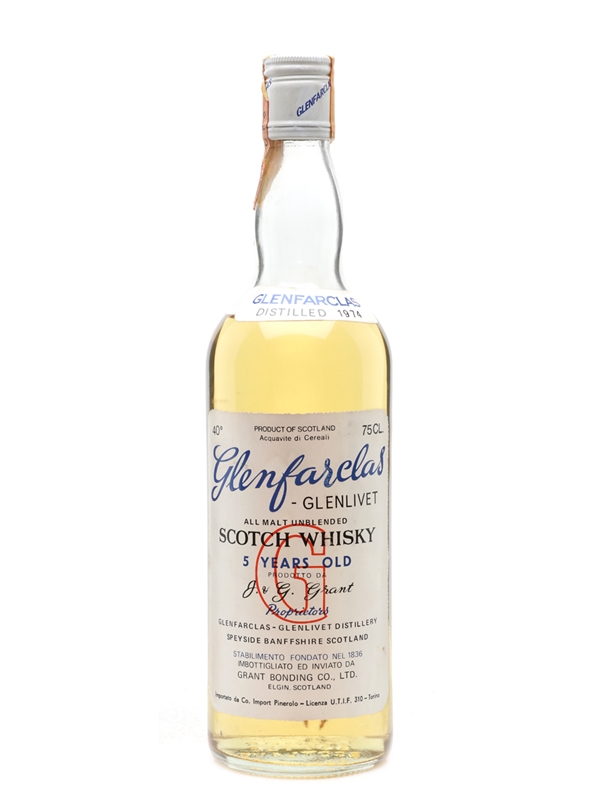 A bottle of Glenfarclas-Glenlivet 5 Year Old. This was distilled in 1974 and bottled and shipped by Grant Bonding Co. Ltd. This was imported to the Italian market by Pinerolo.