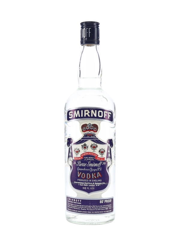 A bottle of Smirnoff Blue Label vodka, produced in England by International Distillers & Vintners Ltd. We estimate this was bottled in the 1970s.