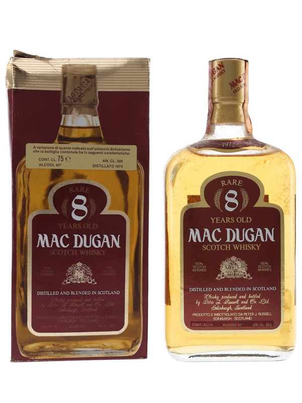 A bottle of Mac Dugan 8 Year Old blended Scotch whisky, made from whiskies distilled in 1972 and bottled Peter J Russell and Co. Ltd. This was imported to Italy by Cora.