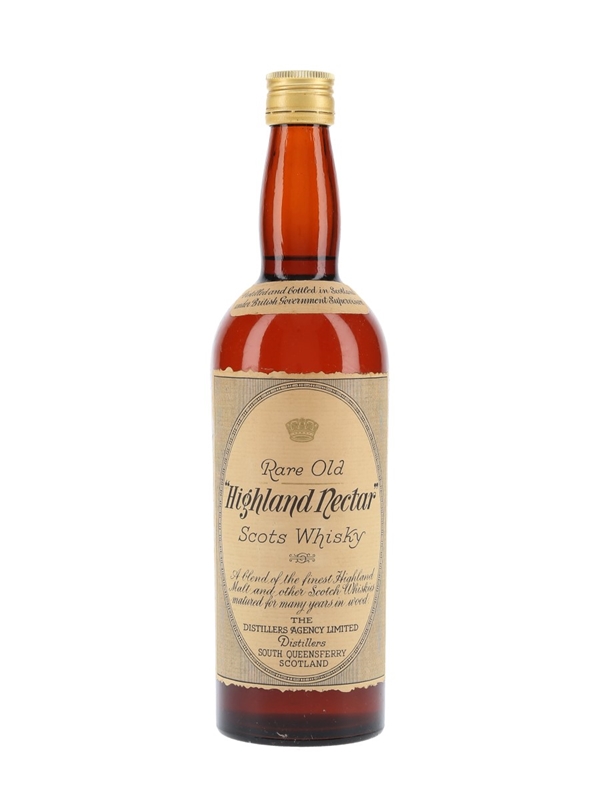 A bottle of Highland Nectar Rare Old blended Scotch whisky, produced by The Distillers Agency Limited, South Queensferry, Scotland. We estimate this was bottled in the 1950s.