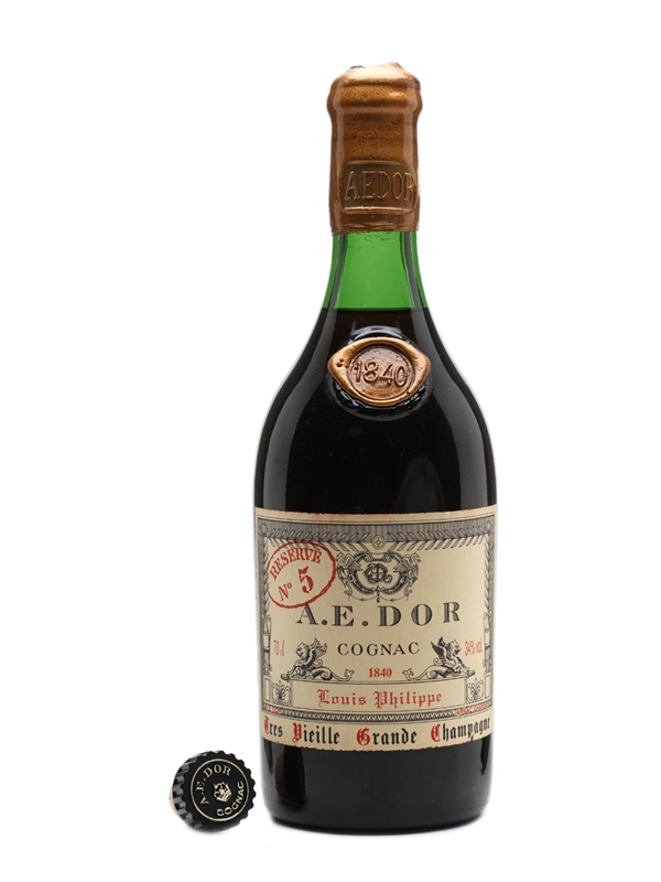 A bottle of A E Dor Reserve No.5 Louis Philippe 1840 Tres Vieille Grande Champagne.