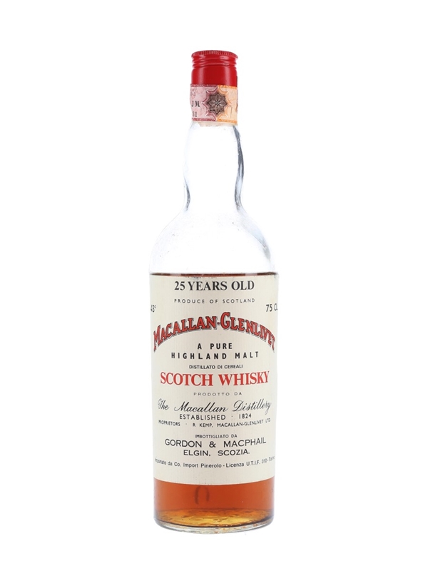 A bottle of The Macallan-Glenlivet 25 Year Old, matured in sherry casks and bottled by Gordon & MacPhail, then the distillery's official bottler. This was bottled for the Italian market and imported by Pinerolo, we estimate in the 1970s.