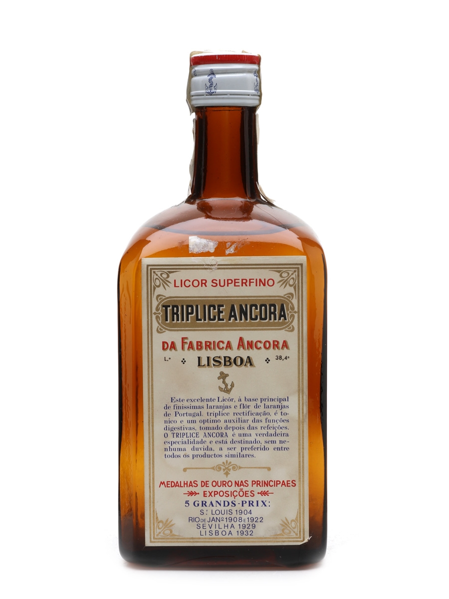 A litre bottle of Triplice Ancora, an orange liqueur from Portugal. We estimate this was bottled in the 1980s.