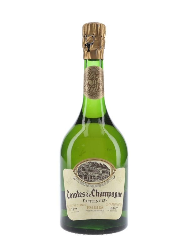 A bottle of 1971 Taittinger Blanc de Blancs, a vintage Champagne produced solely from Chardonnay grapes.