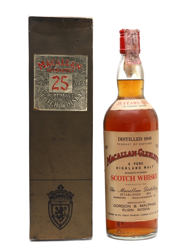 A bottle of Macallan-Glenlivet 25 Year Old. This was distilled in 1948, matured in sherry casks and bottled by Gordon & MacPhail, then the distillery's official bottler. This was bottled for the Italian market and imported by Pinerolo.