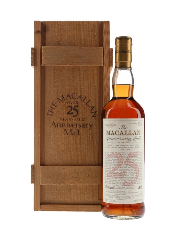 A bottle of The Macallan 25 Year Old, distilled in 1968 and matured in sherry casks before bottling in 1994 as part of the Anniversary Malt series.