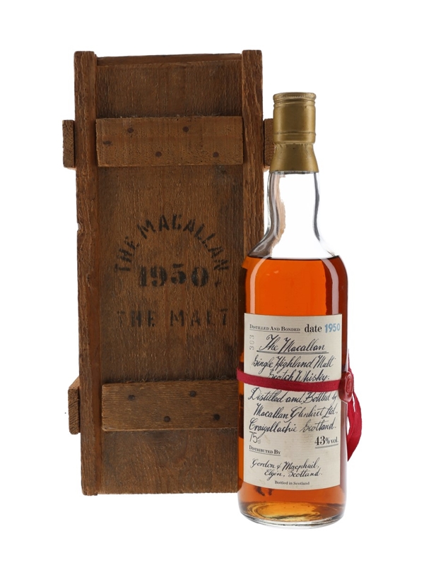 A bottle of The Macallan 1950, bottled in the 1980s by Gordon & MacPhail. This bottling has a handwritten label and is presented in a wooden box.