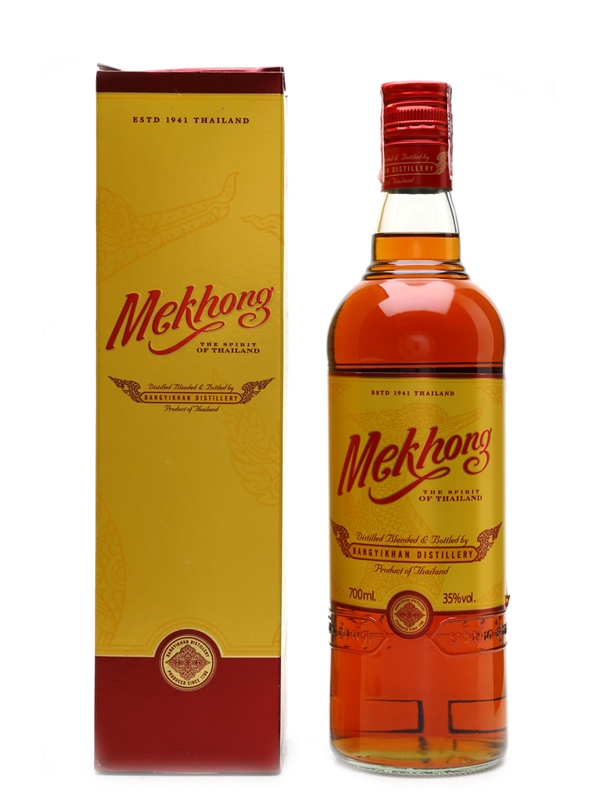 A bottle of Mekhong Thai Spirit. The spirit is produced from 95% sugar cane and 5% rice.