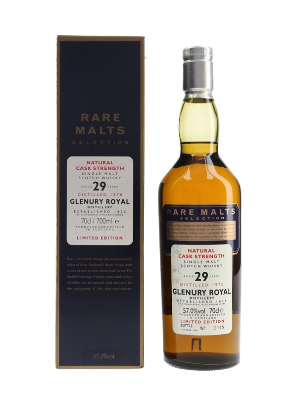 A bottle of Glenury Royal 29 Year Old. This was distilled in 1970 and bottled for Diageo's now-discontinued Rare Malts Selection in October 1999.