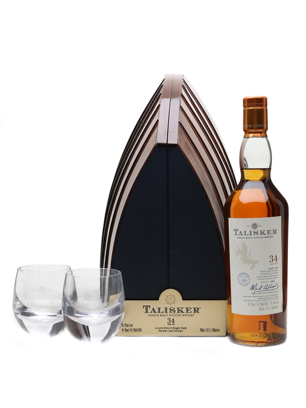 A bottle of Talisker 34 Year Old single malt Scotch whisky from the Isle of Skye. This was distilled in 1975, matured in a single American oak refill cask, and bottled at natural cask strength. This is presented in a boat-shaped cabinet which includes a copper ingot from Talisker's wash still, and comes with a pair of Glencairn Crystal tumblers.