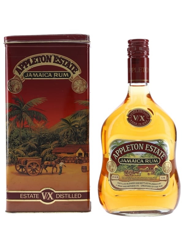 A bottle of Appleton Estate V/X Jamaica rum. This was distilled in copper pot stills, matured in oak casks, and bottled by J Wray & Nephew Ltd.