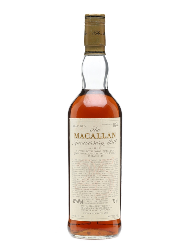 This Macallan single malt Scotch whisky was distilled in 1966, matured in sherry casks for 25 years and bottled in 1992 as part of Macallan's Anniversary Malt series.