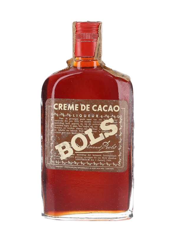 A bottle of Bols Crème de Cacao liqueur produced in the Netherlands, finished and bottled by Erven Lucas Bols, Tarragona, Spain. We estimate this was bottled in the 1960s.