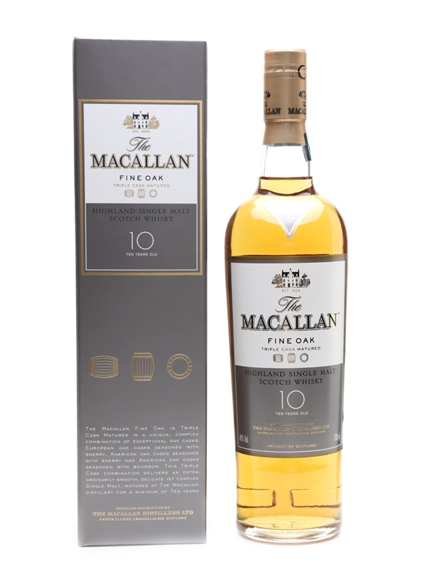A bottle of The Macallan 10 Year Old from the Fine Oak range. This was aged for 10 years in a combination of bourbon and sherry casks.