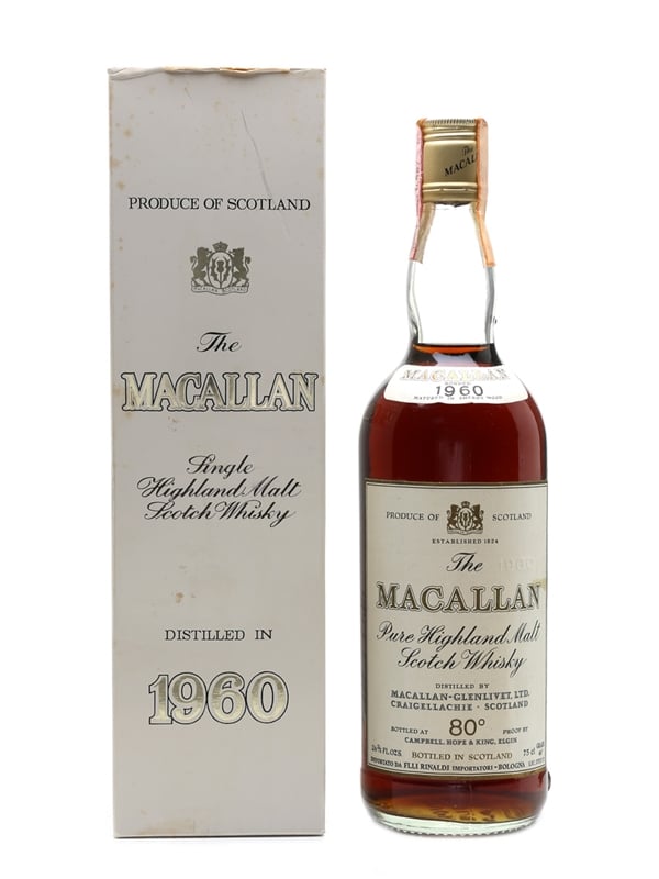 A bottle of The Macallan 1960, bottled by Campbell, Hope & King. This was bottled for the Italian market, and imported by Rinaldi, we estimate in the 1970s.