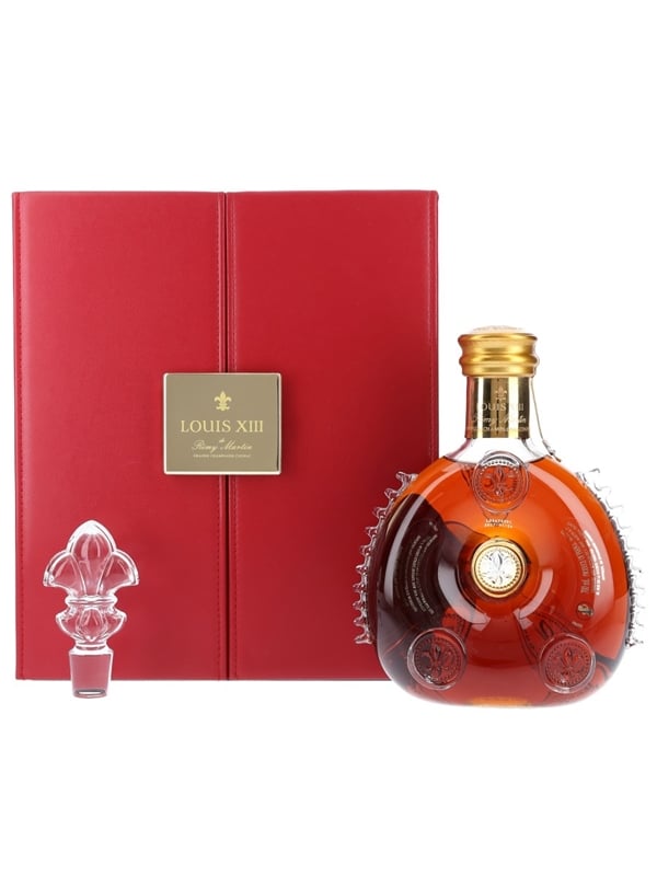 A bottle of Louis XIII de Remy Martin Cognac. This is composed of Grande Champagne eaux-de-vie aged between 40 and 100 years and is presented in a Baccarat crystal decanter. This was bottled on 24 January 2017.