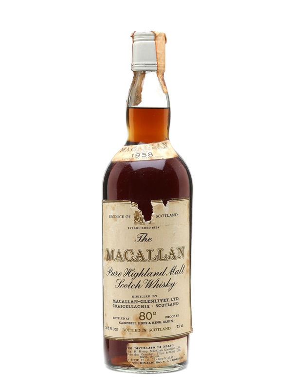 A bottle of The Macallan 1958, bottled by Campbell, Hope and King, we estimate in the 1970s. This was imported for the Italian market by Rinaldi.