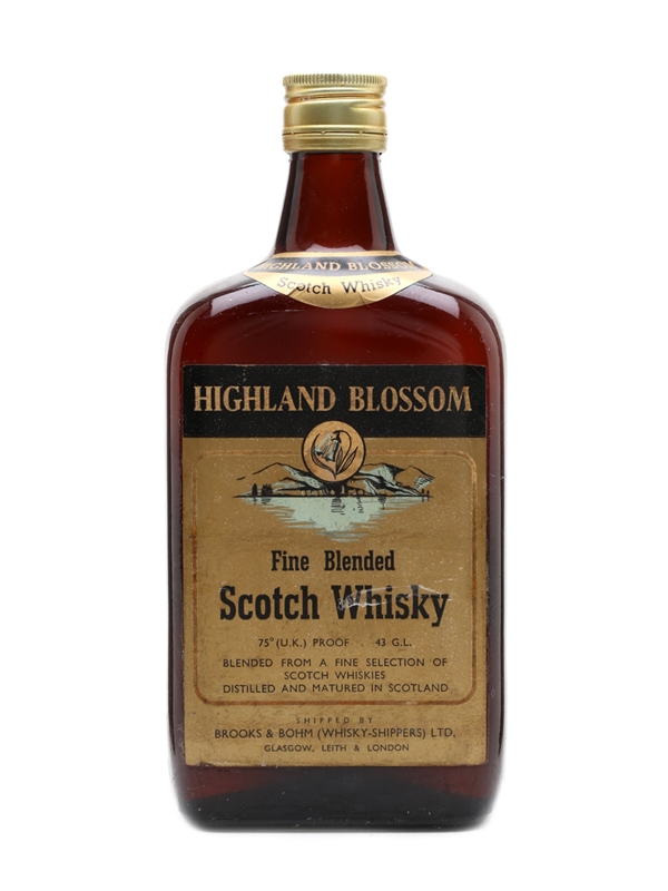 A bottle of Highland Blossom Fine blended Scotch whisky. This was shipped by Brooks & Bohm (Whisky-Shippers) Ltd. We estimate this was bottled in the 1960s.