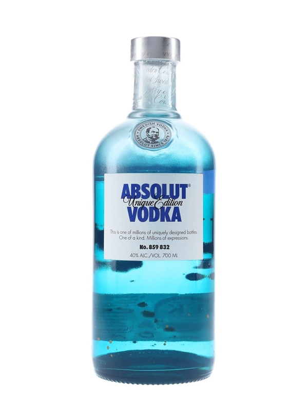 A bottle of Absolut Unique Edition vodka from Sweden. Nearly four million unique bottles were created using splash guns, 31 different colours, 51 different pattern types, and colour generating algorithms to ensure each bottle was one of a kind.