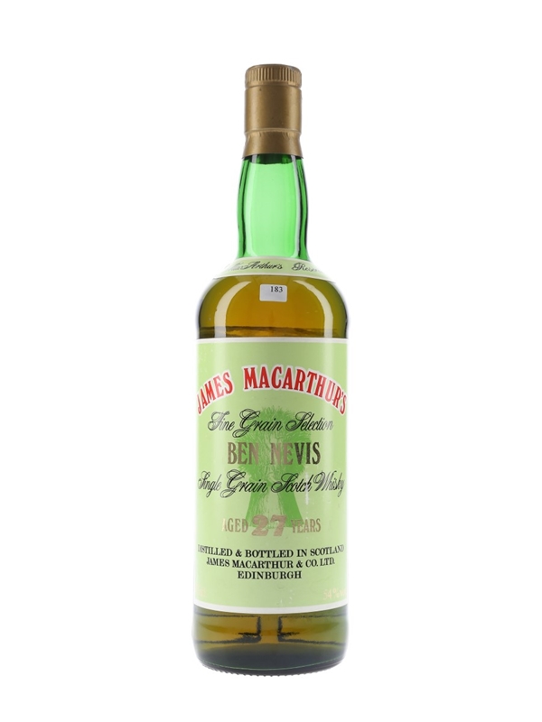 A bottle of Ben Nevis 27 Year Old single grain Scotch whisky, bottled at cask strength by James MacArthur's for the MacArthur's Reserve series. We estimate this was bottled in the early 1990s.