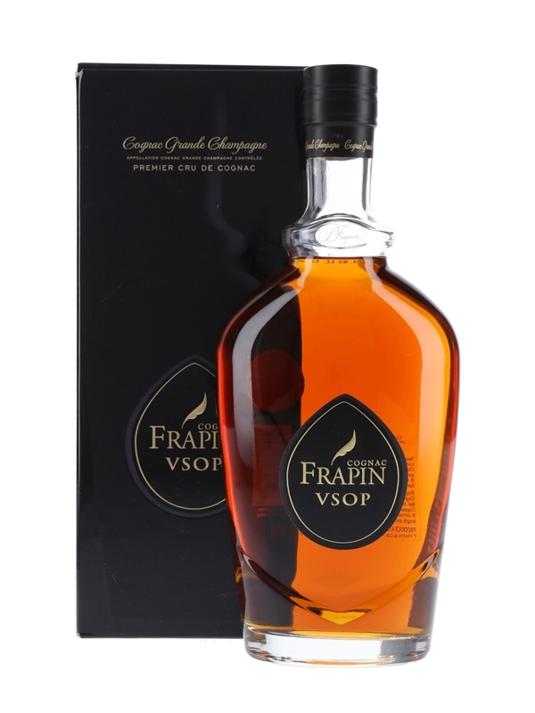 A bottle of Frapin VSOP Grande Champagne Cognac, blended from eaux-de-vie made exclusively from grapes from the Grande Champagne region of Cognac.