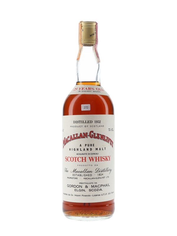 A bottle of The Macallan-Glenlivet 25 Year Old. This was distilled in 1952, matured in sherry wood, and bottled by Gordon & MacPhail for Italian importer Pinerolo.