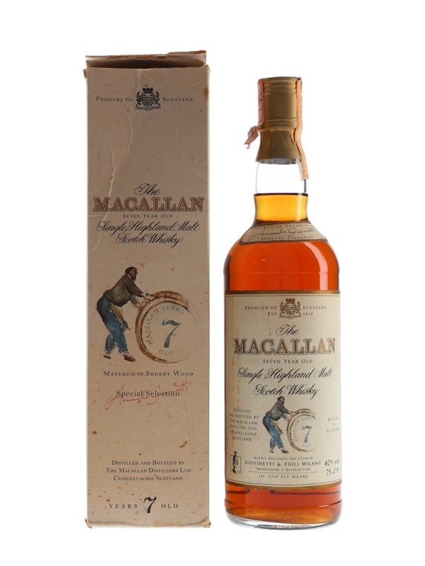 A bottle of The Macallan 7 Year Old, matured in sherry wood and selected by Armando Giovinetti for the Italian market. We estimate this was bottled in the 1980s.