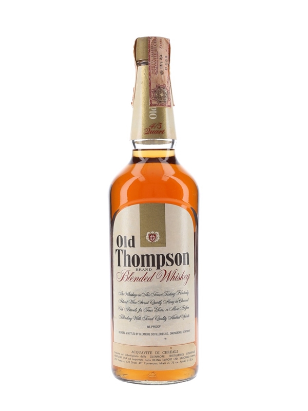 A bottle of Old Thompson Brand Blended Whiskey, blended and bottled by Glenmore Distilleries Co. This blend was made from 62.5% neutral grain spirits and 37.5% four year old straight whiskey. This was bottled for the Italian market and imported by Reyna, we estimate in the 1970s.
