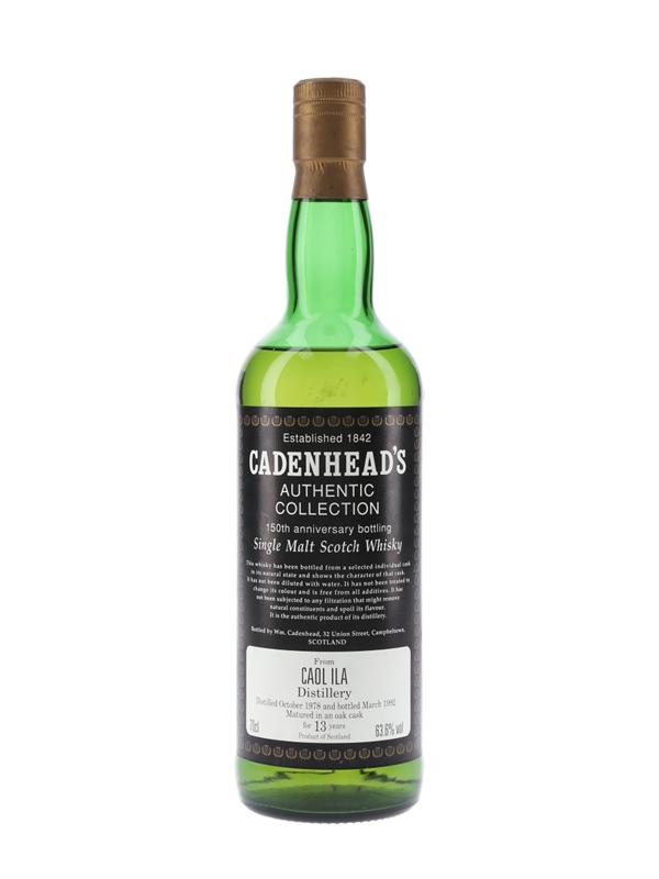 A bottle of Caol Ila 13 Year Old from Cadenhead's Authentic Collection. This was distilled in October 1978, matured in a single cask, and bottled in March 1992 to celebrate the 150th anniversary of Wm Cadenhead.