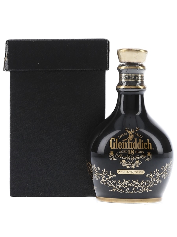 A bottle of Glenfiddich 18 Year Old Ancient Reserve, presented in a black ceramic decanter.
