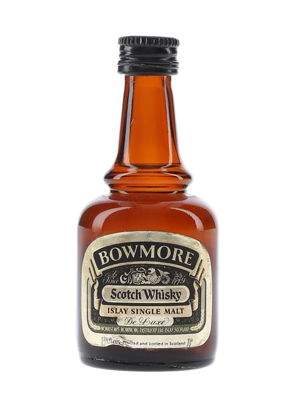 A miniature bottle of Bowmore De Luxe Islay single malt Scotch whisky. We estimate this was bottled in the 1970s.